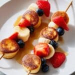 - Step 8: Once cooled, thread 2 to 3 pancake muffins onto each wooden skewer. For added flavor and color, alternate with fresh fruit like strawberries, blueberries, or banana slices, if desired.