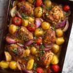 A flavorful Mediterranean Chicken Dinner featuring bone-in, skin-on chicken thighs and drumsticks marinated in a zesty lemon-garlic mixture, baked alongside potatoes, red onions, and cherry tomatoes for a complete and hearty meal.