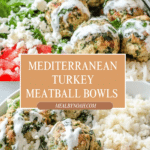 Keywords: Mediterranean meatballs, turkey meatballs, healthy meatball bowls, baked meatballs, lemon parsley rice, cucumber tomato salad, hummus bowls, tzatziki sauce, meal prep bowls