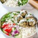 Keywords: Mediterranean meatballs, turkey meatballs, healthy meatball bowls, baked meatballs, lemon parsley rice, cucumber tomato salad, hummus bowls, tzatziki sauce, meal prep bowls