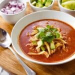 This soup is delicious with crunchy tortilla chips or homemade tortilla strips, plus fresh toppings like avocado, red onion, lime wedges, and coriander to add texture and brightness.
