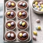 These Mini Chocolate Cheesecakes combine a crunchy milk chocolate digestive biscuit base with a rich and creamy ricotta and dark chocolate filling. Individually portioned in muffin cases and topped with colorful mini chocolate eggs, these delightful desserts are perfect for sharing at parties or enjoying as a sweet treat any time.