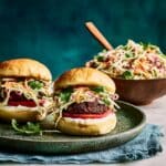- Add Greens and Serve: Top the slaw with a handful of fresh rocket or spinach, place the top bun over the stack, and serve immediately with any remaining slaw on the side.