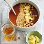 A flavorful Moroccan chickpea soup bursting with aromatic spices, tender chickpeas, roasted red peppers, and a hint of preserved lemon, finished with wholewheat couscous for a hearty and comforting meal.