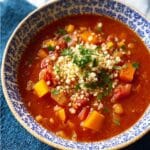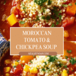 A vibrant and hearty Moroccan tomato and chickpea soup served with fluffy couscous, flavored with warm spices like ras-el-hanout and harissa. This comforting dish combines tender chickpeas, aromatic vegetables, and a blend of North African spices for a flavorful, satisfying meal perfect for any season.