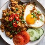 Authentic Indonesian Nasi Goreng recipe featuring flavorful fried rice with chicken, kecap manis, and traditional spices, perfect for a quick and delicious meal garnished with fried eggs, fresh vegetables, and optional shrimp paste.