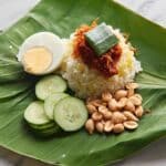 Nasi Lemak Bungkus is a traditional Malaysian dish featuring fragrant steamed coconut pandan rice served with crispy fried anchovies simmered in a tangy tamarind sambal, garnished with crunchy peanuts, fresh cucumber, and quartered hard-boiled eggs, all elegantly wrapped in banana leaves for a flavorful and aromatic meal.