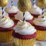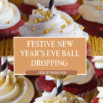 Keywords: New Year’s Eve, cupcakes, red velvet, ball drop, whipped cream frosting, festive desserts, party treats