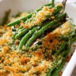 Store leftover roasted green beans in an airtight container in the refrigerator for up to 3 days. Reheat in the oven or a toaster oven at 180°C (350°F) for 5–7 minutes to restore crispiness. Avoid microwaving to keep the topping crunchy.