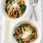 A vibrant and healthy wholemeal penne pasta dish featuring a spicy tomato and spinach sauce, enhanced with garlic, chilli flakes, and a touch of red wine. Finished with grated parmesan or a vegetarian alternative, this recipe is perfect for a quick and flavorful weeknight dinner.