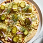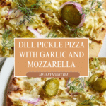 Keywords: pickle pizza, creamy dill pizza, dill pickle pizza, unique pizza recipes, crème fraîche pizza, mozzarella pizza, homemade pizza