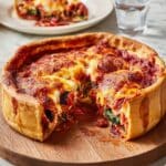 This pizza pie offers a delicious twist on traditional pizza with a layered, stuffed filling that’s bursting with flavor. Crisp on the outside and gooey on the inside, it’s perfect for sharing with family or friends on any occasion.