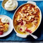 - Bake the dish: Preheat the oven to 180°C (160°C fan) / gas mark 4. Scatter flaked almonds evenly over the top and bake in the middle of the oven for 35 minutes until the custard is just set and almonds are toasted.