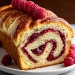Keywords: Raspberry swirl brioche, sweet bread recipe, homemade brioche loaf, raspberry jam bread, fluffy brioche