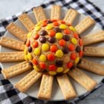 - Decorate and Serve: Before serving, press Reese’s Pieces candies onto the surface of the chilled ball for a colorful, crunchy finish. Serve the dip with graham crackers for dipping.