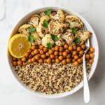 This Roasted Cauliflower and Chickpeas recipe features crispy roasted chickpeas and cauliflower tossed in a tangy mustard dressing, served over fluffy quinoa. It’s a hearty and nutritious vegetarian meal that combines warm roasted vegetables with zesty, flavorful mustard dressing, making it perfect for a comforting lunch or dinner.