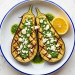 - Assemble and Serve: Once the eggplant is roasted, transfer the halves to a serving plate. Spoon the freshly made mint sauce evenly over the eggplant and sprinkle with 1/4 cup crumbled feta cheese. Serve warm or at room temperature.