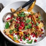 - Assemble the fattoush: On a large serving platter, arrange the roasted root vegetables. Scatter over the chopped parsley, mint, sliced red chilli, pomegranate seeds, and toasted pita crisps. Drizzle some of the nut-brown butter yogurt dressing over the top, and serve the remaining dressing on the side so everyone can add as much as they like.
