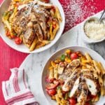 A delicious and wholesome roasted summer vegetable and chicken pasta dish featuring tender chicken breasts roasted with vibrant seasonal vegetables, tossed with wholemeal pasta and finished with a hearty garlic and tomato sauce, parmesan, and a hint of chilli for a subtle kick.