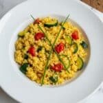 A vibrant and creamy saffron risotto infused with aromatic saffron threads, sun-dried tomatoes, fresh zucchini, and a blend of garlic and onion. This comforting Italian dish is cooked slowly with vegetable broth and white wine to achieve the perfect rich and creamy texture, finished off with fresh chives for a burst of flavor.