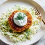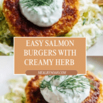 Delicious and easy-to-make salmon burgers paired with a creamy, tangy herb slaw. These salmon burgers are pan-fried to a golden crisp and served atop a refreshing yogurt-based cabbage slaw, perfect for a light yet satisfying meal.
