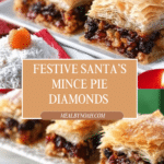 Santa’s mince pie diamonds are a festive twist on traditional mince pies, featuring layers of dried fruits and spices sandwiched between crisp, buttery filo pastry sheets. These delightful diamond-shaped treats are baked until golden and finished with a warm honey-lemon glaze for a perfect holiday dessert.