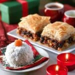 Santa’s mince pie diamonds are a festive twist on traditional mince pies, featuring layers of dried fruits and spices sandwiched between crisp, buttery filo pastry sheets. These delightful diamond-shaped treats are baked until golden and finished with a warm honey-lemon glaze for a perfect holiday dessert.