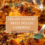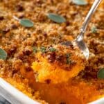 This Savoury Sweet Potato Casserole is a comforting and flavorful side dish featuring tender baked sweet potatoes mashed with sour cream, parmesan, and browned butter infused with crispy sage leaves. Topped with a crunchy panko, parmesan, and bacon mixture, this casserole is baked to golden perfection, making it an ideal accompaniment for any hearty meal.