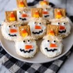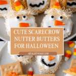 Create festive and fun Scarecrow Nutter Butters, a delightful Halloween-themed treat featuring nutter butter cookies dipped in white chocolate and decorated with candy eyes, candy corn, graham crackers, and mini shredded wheat for a spooky scarecrow look. Perfect for holiday parties and fun family snacks.