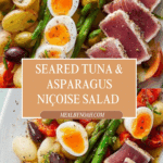 A vibrant and healthy Seared Tuna & Asparagus Niçoise salad featuring perfectly cooked new potatoes, crisp asparagus, soft-boiled eggs, and sashimi-grade tuna seared to perfection. Tossed with juicy tomatoes, Kalamata olives, caper berries, and a zesty anchovy-garlic dressing, this dish is a refreshing twist on the classic Niçoise salad.
