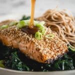 - Serve: Plate the rested sesame-crusted salmon over or beside the soba noodle and greens bowls. Drizzle the prepared dressing on top or serve on the side. Garnish with sliced shallots or scallions if desired.