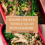 A vibrant and nutritious sesame, edamame, and chicken noodle salad featuring wholewheat noodles, tender shredded chicken, crunchy broccoli, and toasted sesame seeds, tossed in a flavorful tahini and sesame oil dressing. Perfect as a light lunch or make-ahead meal that can be enjoyed cold.