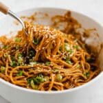 - Toss and serve: Place the cooked noodles in a large bowl. Add the sliced green onions, sauce, sesame seeds, and crushed peanuts if using. Toss everything well to coat the noodles evenly. Garnish with additional sesame seeds and crushed peanuts if desired. Serve the noodles warm or at room temperature.