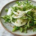A refreshing and vibrant shaved fennel and rocket salad that combines crisp, thinly sliced fennel with peppery rocket, enhanced by a lemony, slightly pickled dressing with optional fennel seeds for added flavor.