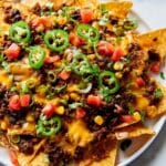 Store any leftover nachos in an airtight container in the refrigerator for up to 2 days. Reheat in a preheated oven at 350°F for about 10 minutes to keep the chips crispy and cheese melted. Avoid microwaving as it can make the chips soggy.