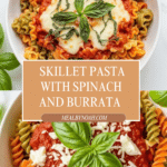 This Skillet Pasta with Spinach and Burrata is a comforting and flavorful Italian-inspired dish that combines al dente pasta with a rich tomato sauce, fresh spinach, and creamy burrata cheese. Cooked on the stovetop then baked briefly to melt the cheese and blend flavors, it makes for a perfect weeknight dinner or cozy meal. Fresh basil and optional Parmesan add vibrant aroma and depth.