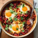 A hearty and flavorful smoky beans and baked eggs dish combining tender onions, red peppers, garlic, and smoked paprika with black or pinto beans simmered in a rich tomato sauce, topped with gently cooked eggs and fresh coriander. Perfect for a nutritious breakfast or comforting brunch.
