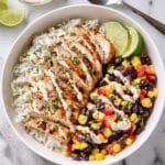 - Assemble the Bowls. Place a generous scoop of cilantro lime rice at the base of each bowl. Slice the rested grilled chicken into thin strips and layer over the rice. Spoon ¼ cup of black bean and corn salsa on top, then drizzle with about a tablespoon of the creamy Southwest sauce. Serve immediately and enjoy!