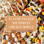 This flavorful Southwest Chicken Bowl features grilled, spiced chicken breast served on a bed of cilantro lime rice, topped with a vibrant black bean and corn salsa and a creamy homemade Southwest sauce. Perfect for a quick, satisfying meal with a kick of southwest-inspired spices and fresh lime juice.