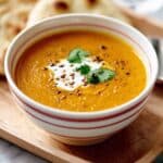 - Season and serve: Taste the soup and adjust seasoning as needed. Serve the soup hot, garnished with a dollop of plain yogurt and a sprinkle of the reserved toasted spices. Pair with warmed naan bread on the side for a complete meal.