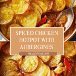 A flavorful spiced chicken hotpot combining tender chicken thigh chunks with aromatic spices, chickpeas, aubergines, apricots, and thinly sliced potatoes baked to perfection in a rich and fragrant casserole.