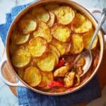 A flavorful spiced chicken hotpot combining tender chicken thigh chunks with aromatic spices, chickpeas, aubergines, apricots, and thinly sliced potatoes baked to perfection in a rich and fragrant casserole.