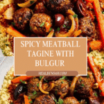 This Spicy Meatball Tagine with Bulgur & Chickpeas is a flavorful North African-inspired dish featuring tender beef meatballs simmered with aromatic spices, tomatoes, and olives, served alongside hearty bulgur wheat and protein-rich chickpeas. It combines a lovely balance of heat, zest, and earthiness, perfect for a comforting and wholesome meal.