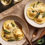 Keywords: spinach ravioli, ricotta ravioli, homemade pasta, sage butter sauce, Italian pasta, fresh ravioli