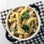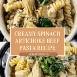 Keywords: spinach artichoke dip, beef pasta, creamy pasta, ground beef recipe, easy dinner, comfort food, one pan meal