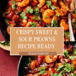 This Sweet & Sour Prawns recipe features crispy fried king prawns tossed in a vibrant, tangy sauce made with malt vinegar, soy sauce, and tomato ketchup. The dish is enhanced with fresh ginger, garlic, and crunchy red peppers, served alongside fluffy cooked rice and garnished with aromatic coriander leaves. Perfectly balancing sweet, sour, and savory flavors, this is an easy, quick, and flavorful stir-fry that brightens up any meal.