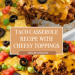 This taco casserole is a delicious and comforting dish that brings all the flavors of a classic taco into one easy-to-make bake. Perfect for family dinners or casual gatherings, it combines seasoned ground beef, refried beans, and plenty of cheese topped with crunchy tortilla chips and fresh garnishes.