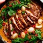 This Thai Red Duck Curry is a wonderfully rich and flavorful dish featuring crispy-skinned duck breasts simmered in a fragrant red curry sauce. With the perfect balance of spicy, sweet, and savory notes, it’s elevated by fresh herbs and the option of lychees or pineapple for a tropical twist. Serve it alongside jasmine rice for a memorable meal.