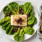 A flavorful and healthy dish featuring tender red snapper fillets baked in tin foil with fresh herbs and lemon, served alongside a vibrant kilt lettuce salad tossed in a tangy cherry vinaigrette.